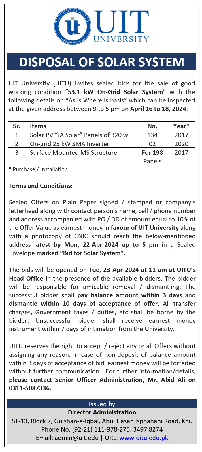UIT University (UITU) invites sealed bids for the sale of good working condition “53.1 kW On-Grid Solar System” with the following details on “As is Where is basis” which can be inspected at the given address between 9:00 to 5:00 pm on April 16 to 18, 2024: