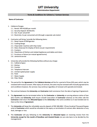 UITU reserves the right to accept / reject any or all Offers without assigning any reason. In case of non-deposit of balance amount within 3 days of acceptance of bid, earnest money will be forfeited without further communication. For further information/details, please contact Senior Officer Administration, Mr. Abid Ali on 0311-5087336.